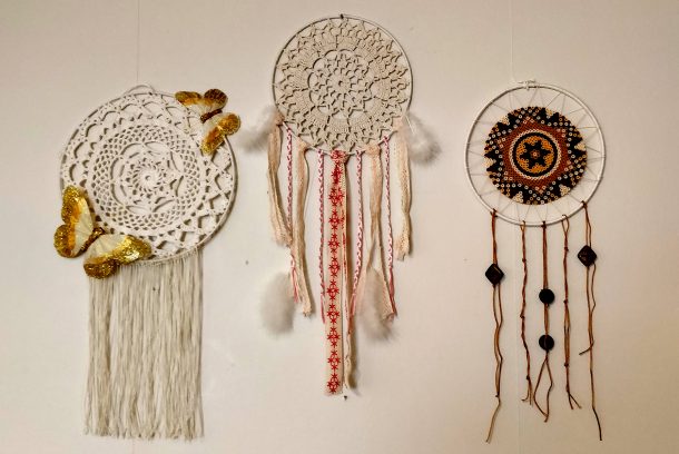 Skapa en egen drömfångare – gärna med återbruk av textil och annat du har hemma. Material finns....