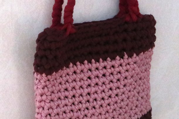 Ulla Andersson visar exempel på några virkade väskor och berättar om sina erfarenheter.