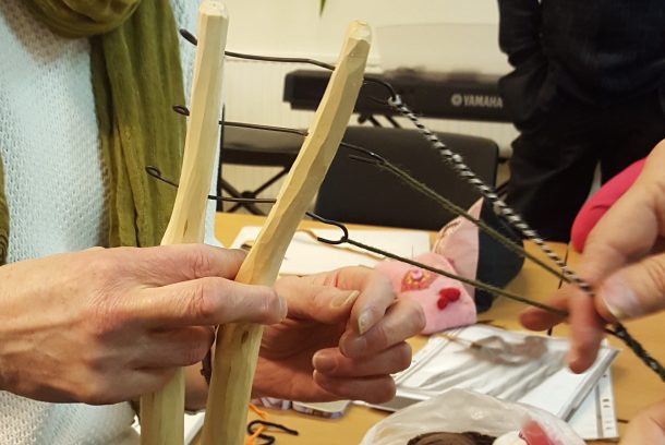 Eva Grundén visar hur vi av metalltråd slöjdar nystkrokar. Krokarna används för att kunna fästa garnet i linningen...